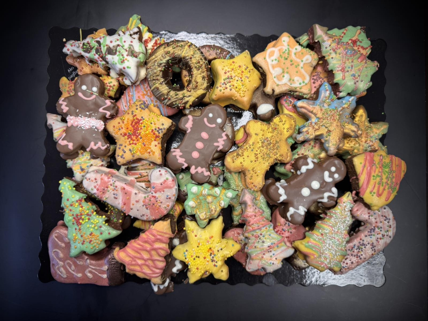 Коледни сладки, направени от кексово тесто, красиво украсени с цветни шоколадови глазури.