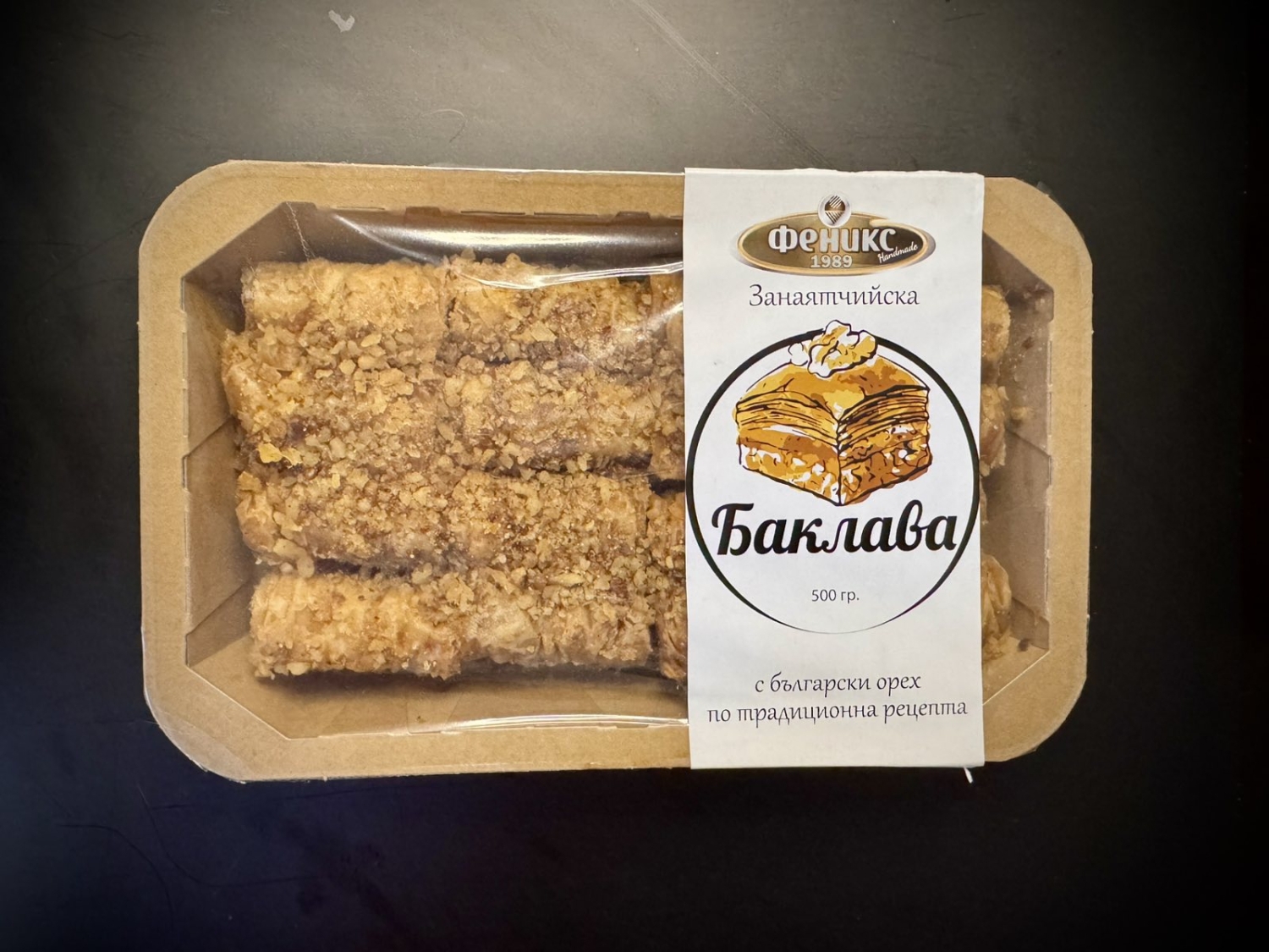 Съставки: Пшен.брашно, орехи, вода, олио, глюкоза, сол, канела.